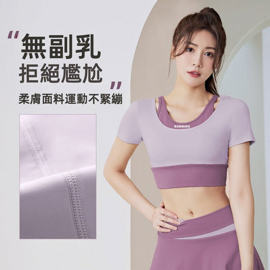 【TBa03】瑜珈跑步健身緊身運動速乾帶胸墊瑜伽假兩件撞色短袖上衣★Chiu3★